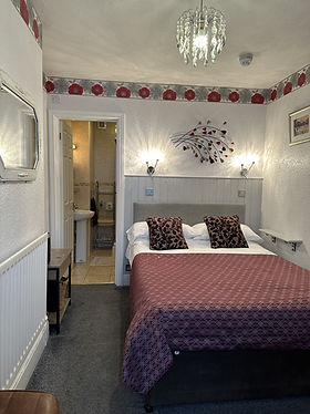 An en-suite double bedded room on the first floor. Facing the front of the house it has a street view. There's ample wardrobe and drawer storage, central heating, TV, kettle & hospitality tray (re-filled daily) hair dryer & radio alarm clock. The en-suite has shelving, a wash basin, WC & a step in thermostatic mixer shower. Towels are provided. A dog is allowed to stay in room No. 6 with the owner, by prior arrangement when booking. There is a single occupancy discount in this room.
